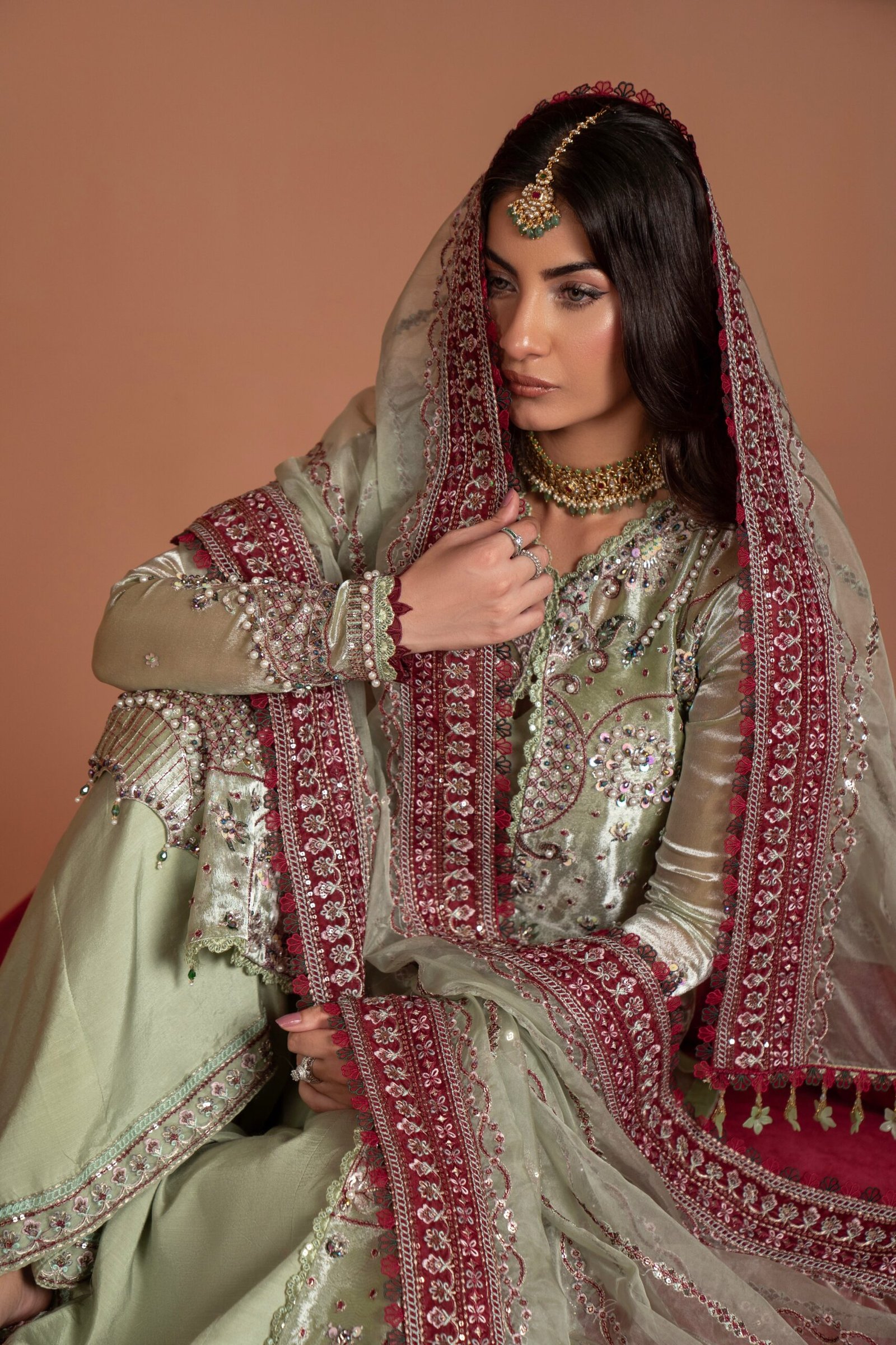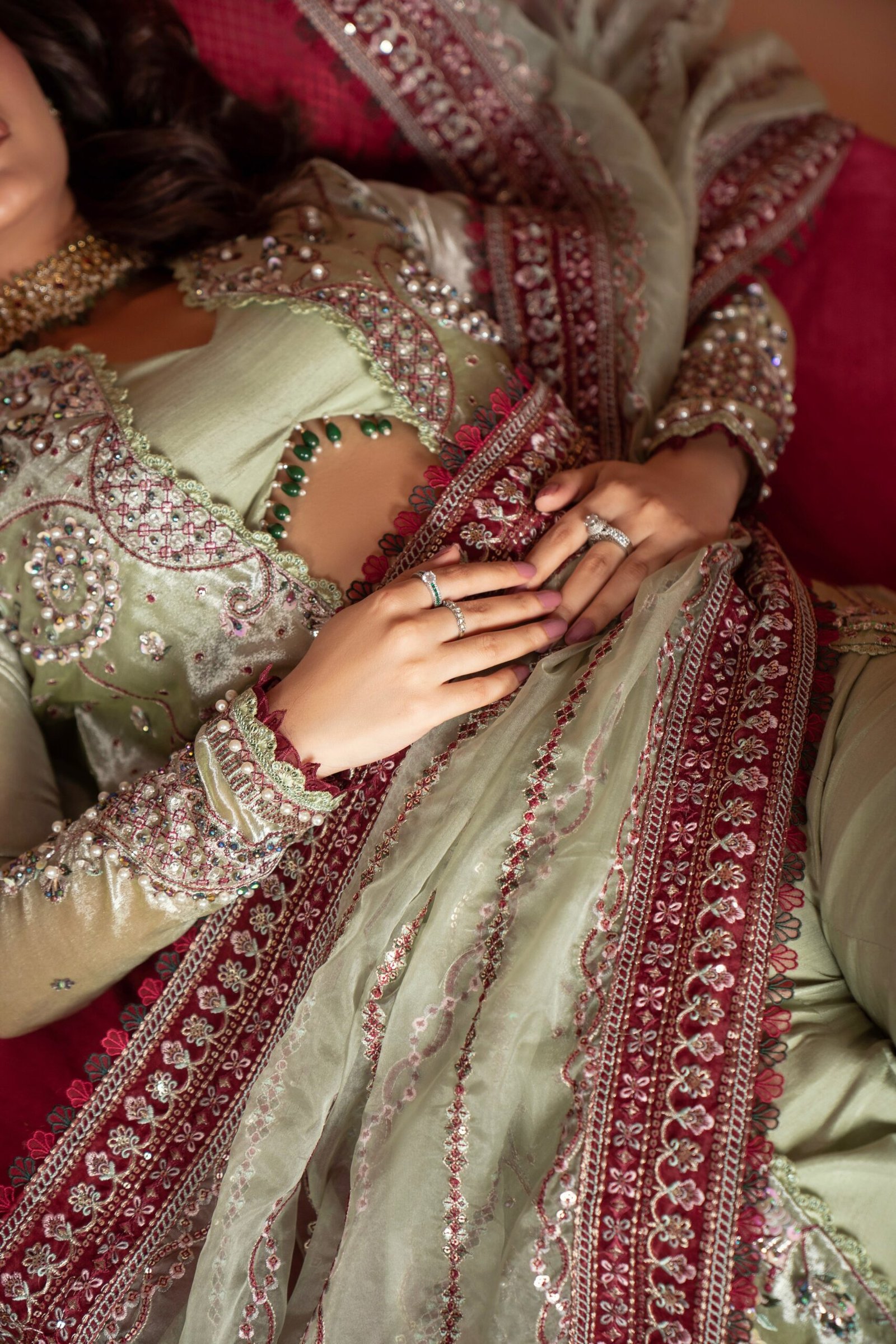 A refined blend of tradition and elegance, this ensemble features a luminous zarri tissue shirt that radiates festive charm. Paired with tailored Korean raw silk pants for a sleek finish, the look is completed by a delicate organza dupatta, adding an airy sophistication. Thoughtfully proportioned, this outfit offers timeless grace with modern refinement.