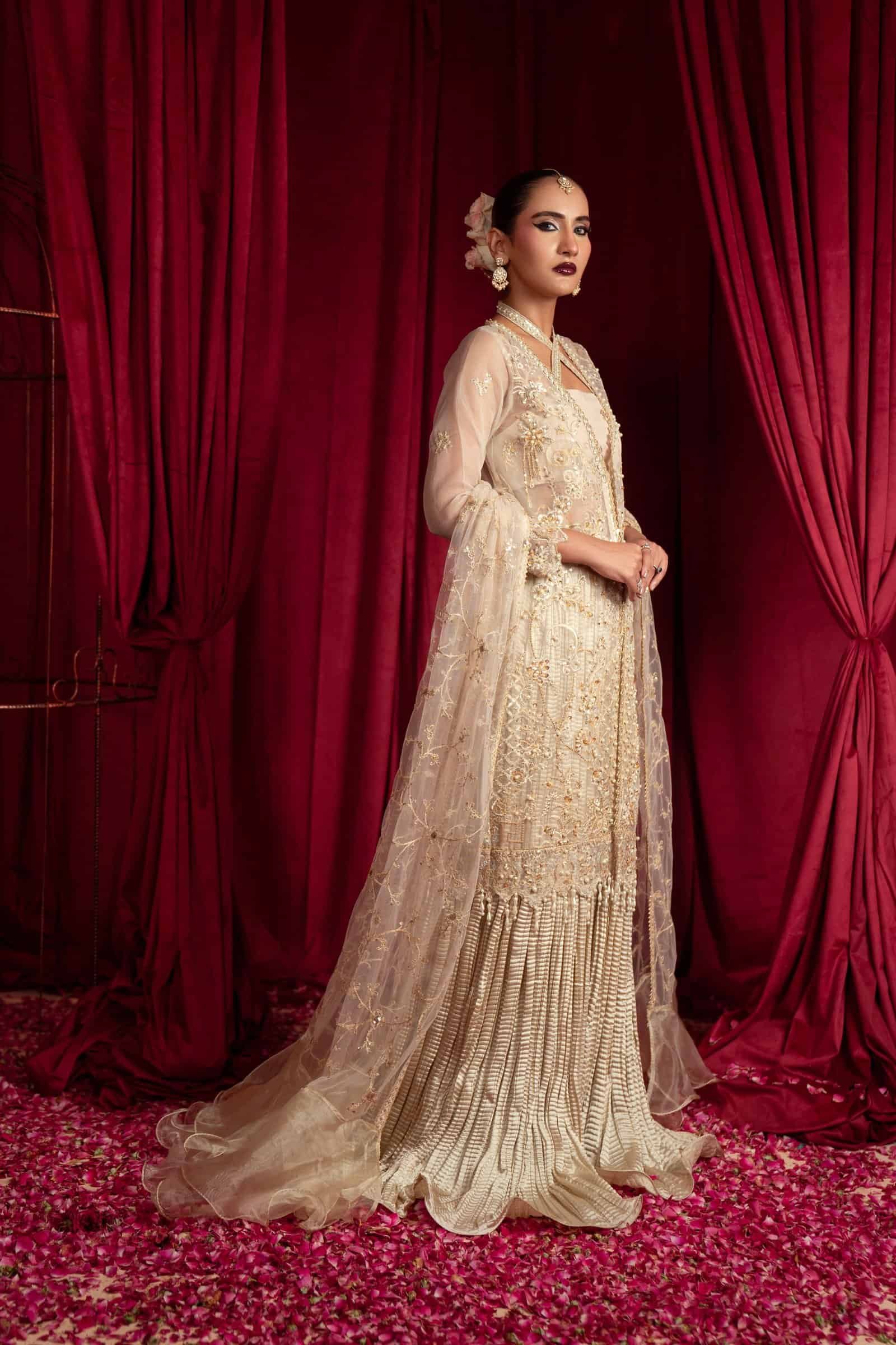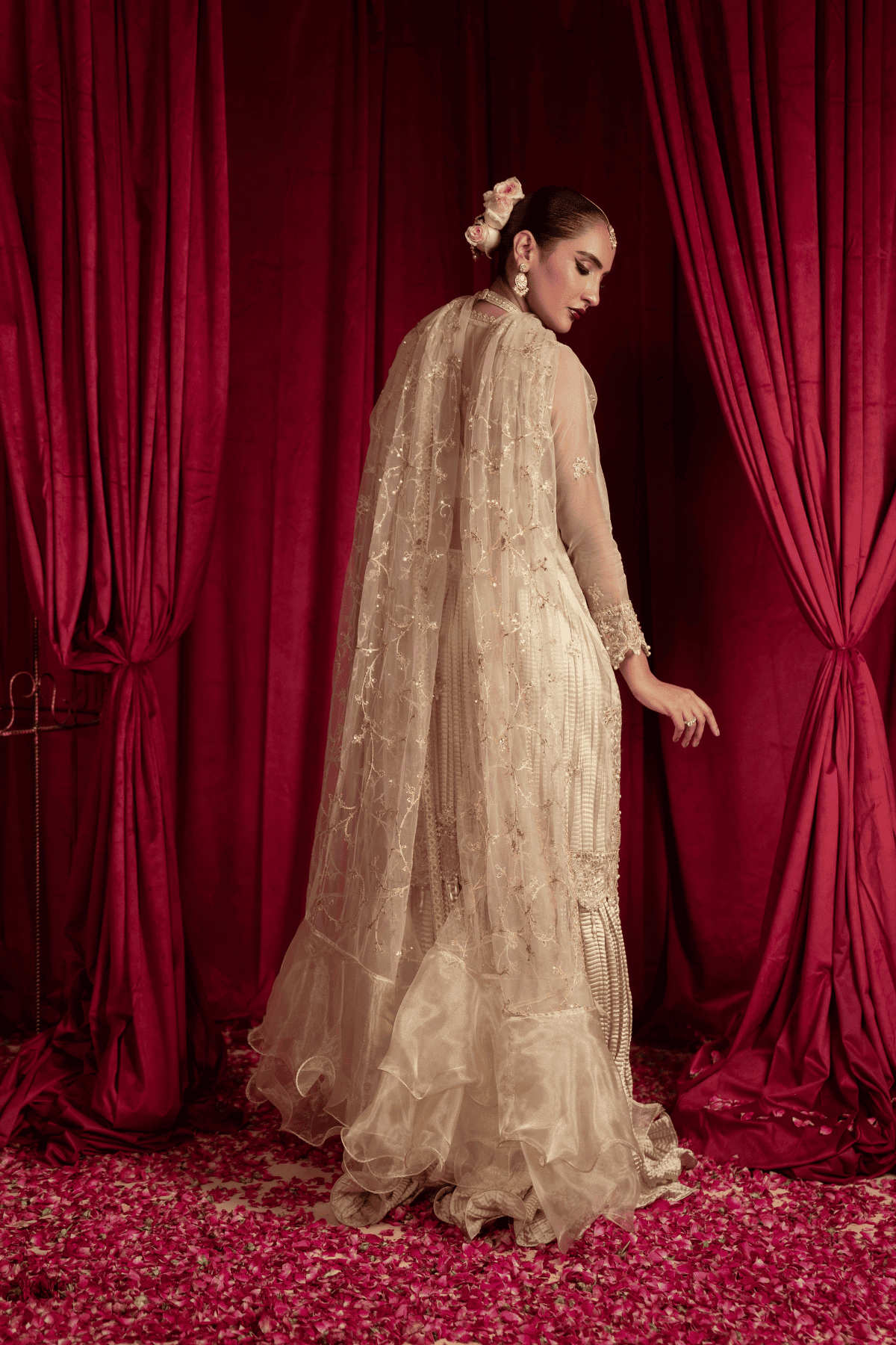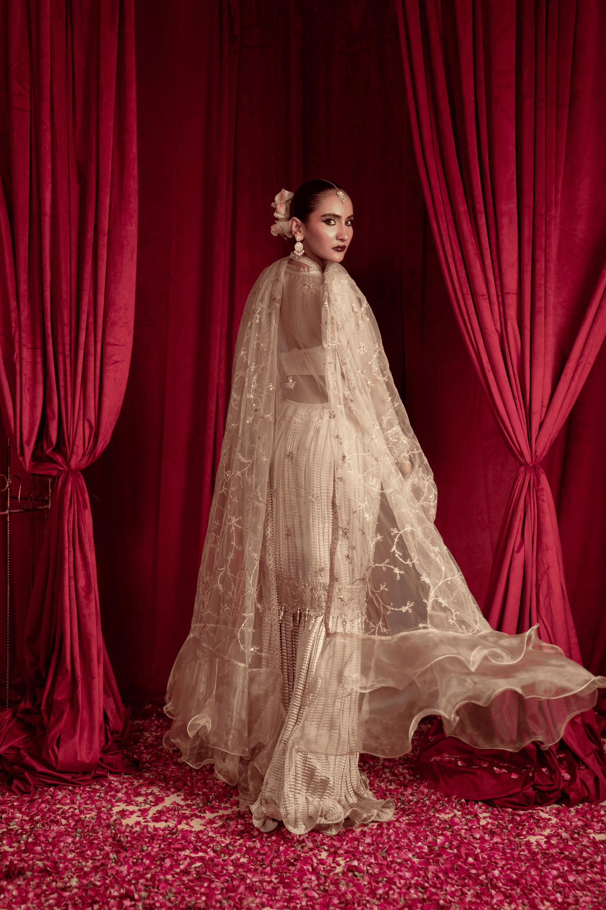 An elegant composition that blends tradition with charm. The sheer organza shirt offers a delicate, refined silhouette, while the silk crushed sharara adds flowing volume and movement. Completing the ensemble, a graceful net dupatta of generous length drapes beautifully for timeless sophistication. Designed with balanced proportions, this outfit radiates poise and grace.
