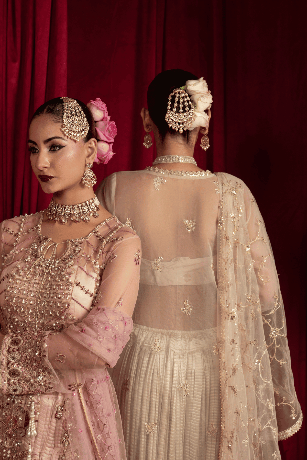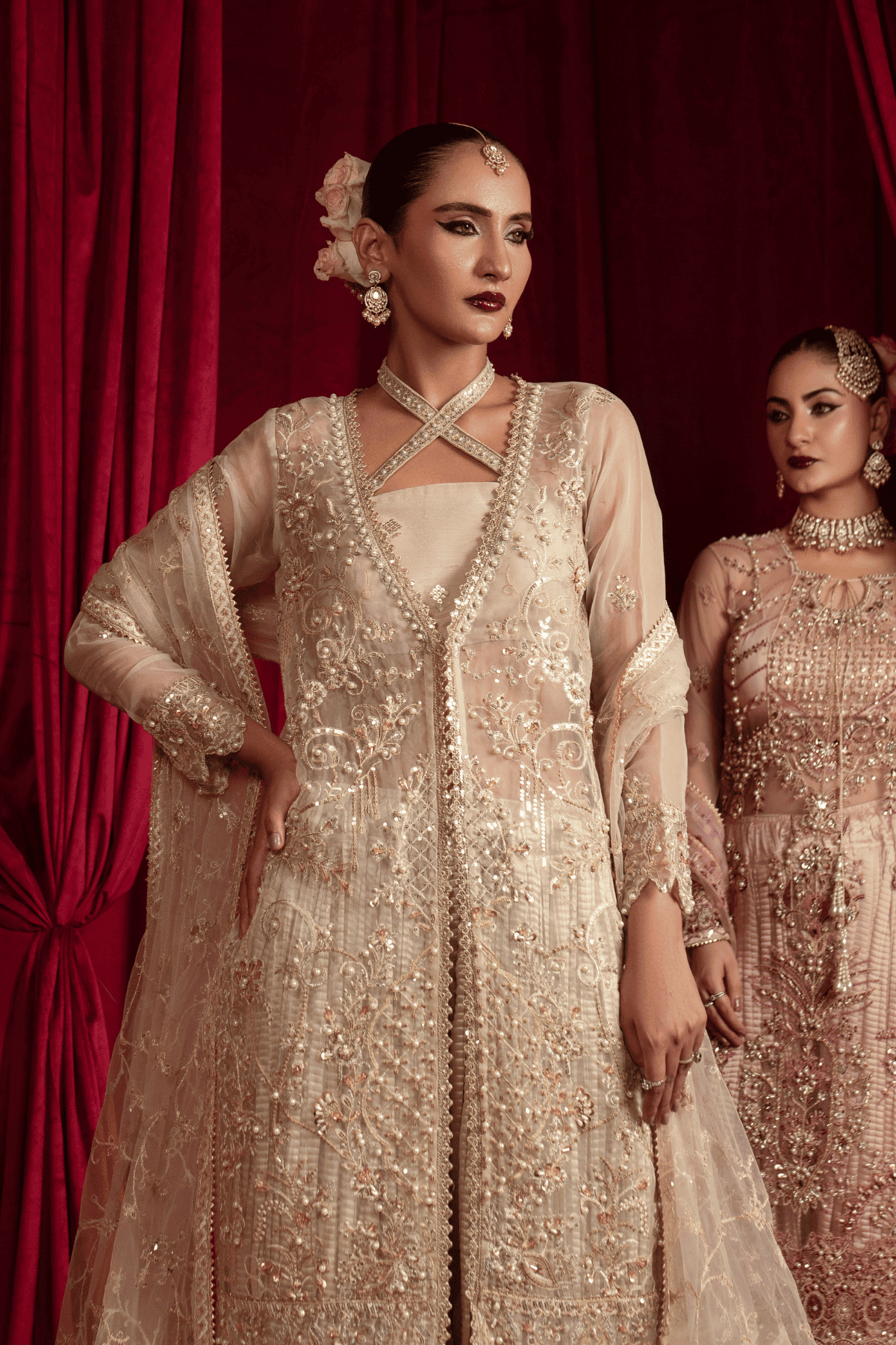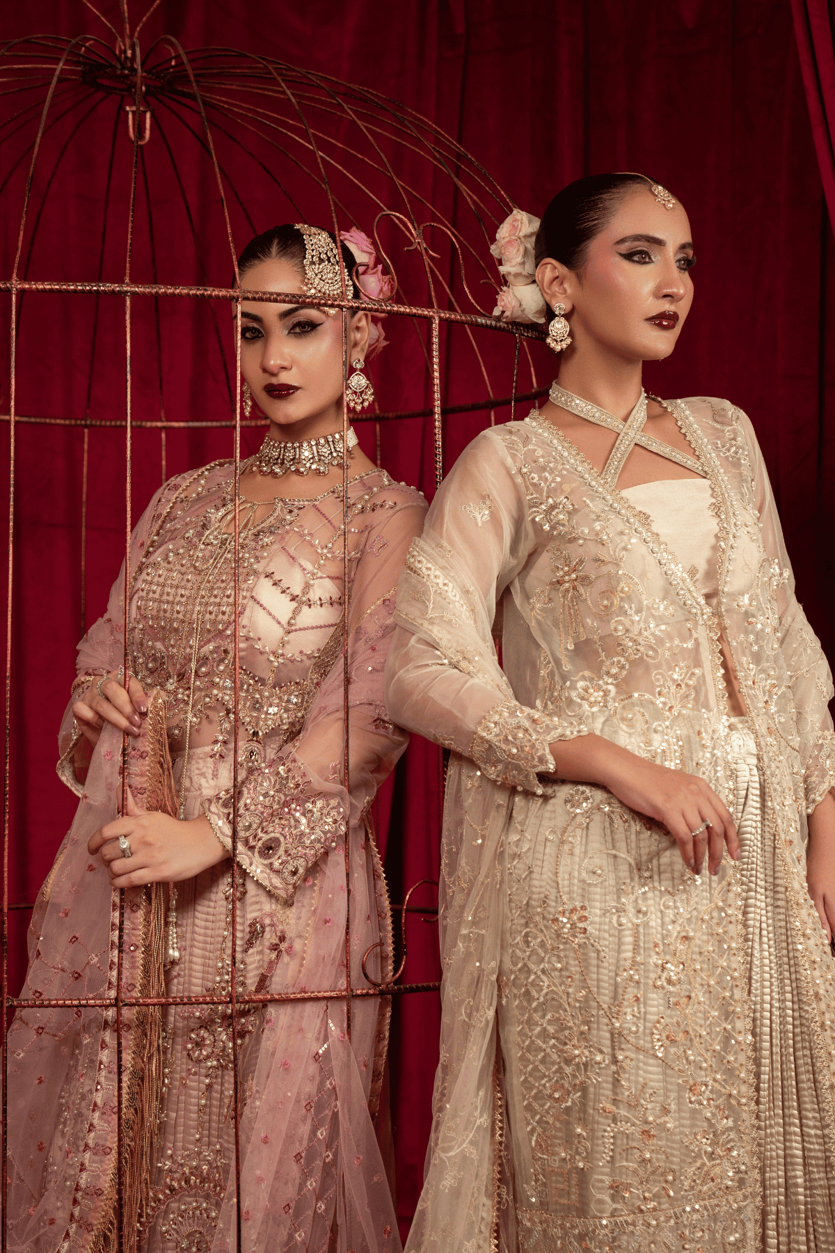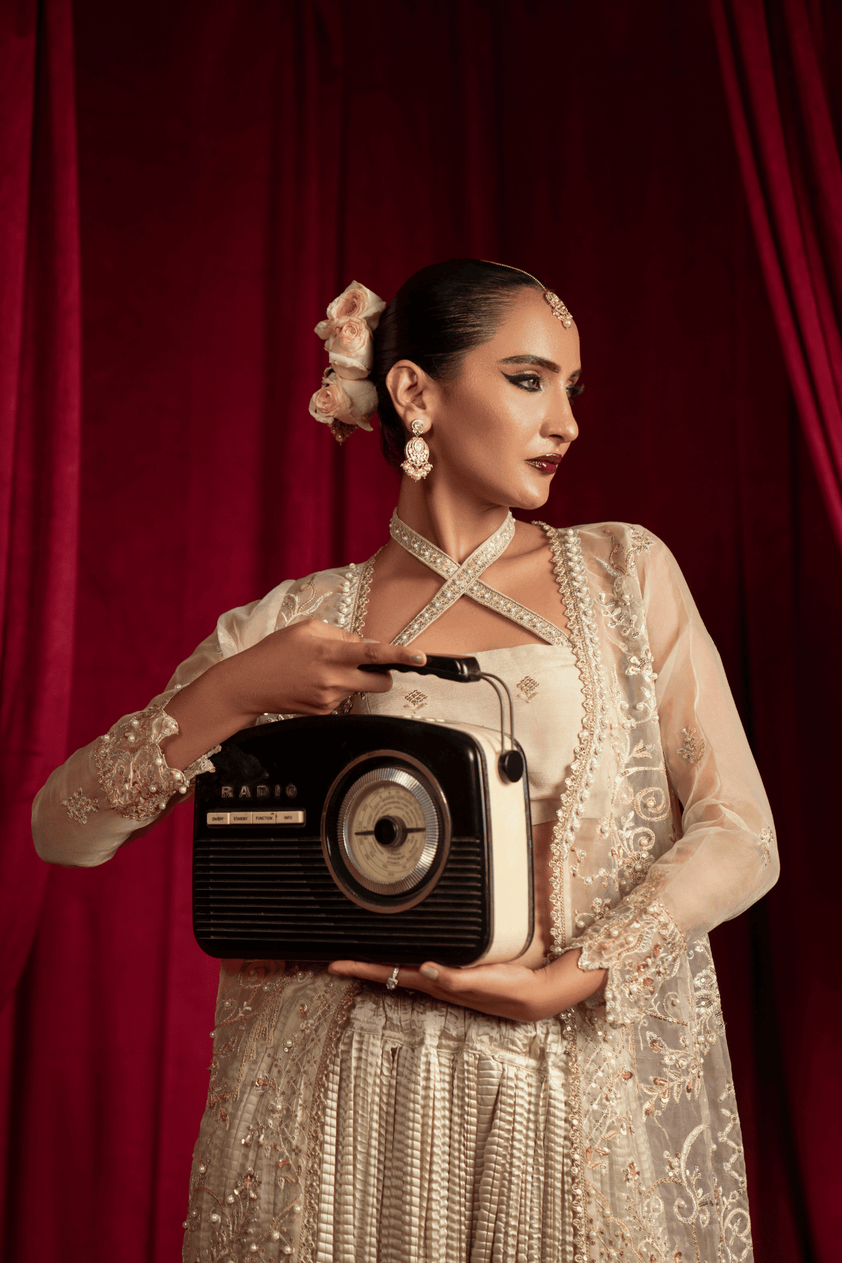 An elegant composition that blends tradition with charm. The sheer organza shirt offers a delicate, refined silhouette, while the silk crushed sharara adds flowing volume and movement. Completing the ensemble, a graceful net dupatta of generous length drapes beautifully for timeless sophistication. Designed with balanced proportions, this outfit radiates poise and grace.